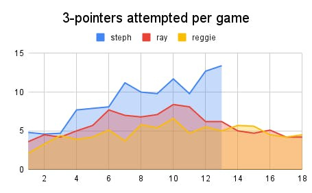 Curry is cut from the same cloth. He is the shooter of his generation. He can run forever. And he can create with the ball in his hands. He does everything Ray and Reggie did and more. He's shown more craft with the ball and more juice off the dribble, and he's taken shooting — literally — to new depths. He shoots from farther away, but also with more accuracy, than anyone thought possible. And speaking of more, just look at the overall volume of attempts Curry gets up compared to the previous three-point kings.